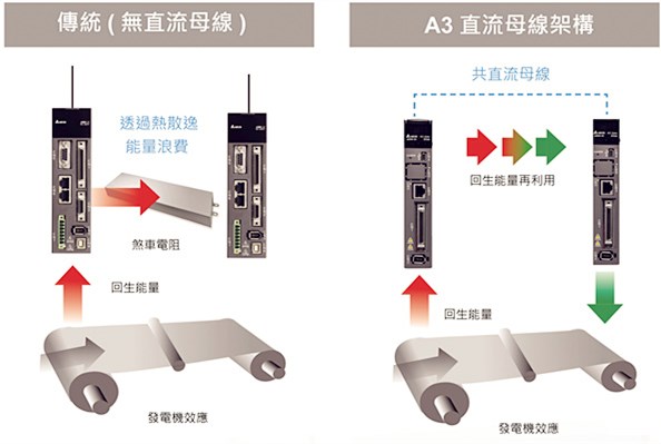 多軸共直流母線設(shè)計(jì),保持直流母線電壓穩(wěn)定,回生能量再利用,機(jī)械設(shè)備更節(jié)能