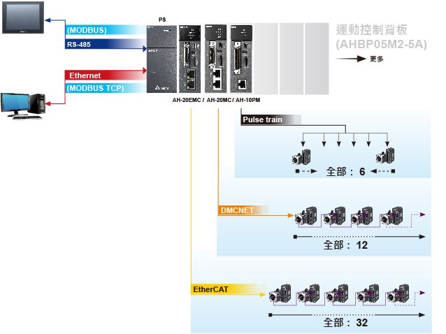 提供 EtherCAT、DMCNET 與 Pulse-train 等運動控制接口