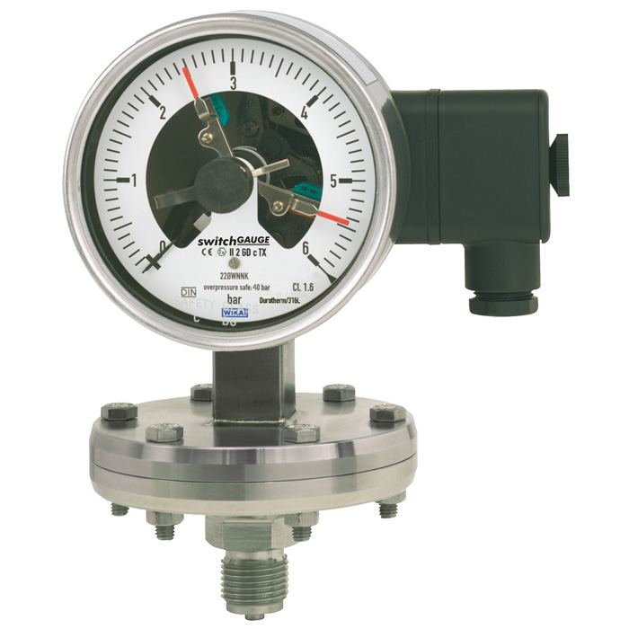 開(kāi)關(guān)電接點(diǎn)(報(bào)警用電子式電接點(diǎn))可根據(jù)儀表的指針位置接通和關(guān)斷電氣控制電路。開(kāi)關(guān)電接點(diǎn)在全量程范圍內(nèi)可調(diào)(參見(jiàn)DIN 16085)。通常情況下,電接點(diǎn)都安裝在表盤(pán)下面,只有少數(shù)是安裝在表盤(pán)上面。儀器指針(實(shí)際值指針)可在整個(gè)量程范圍內(nèi)自由旋轉(zhuǎn),與設(shè)定無(wú)關(guān)。