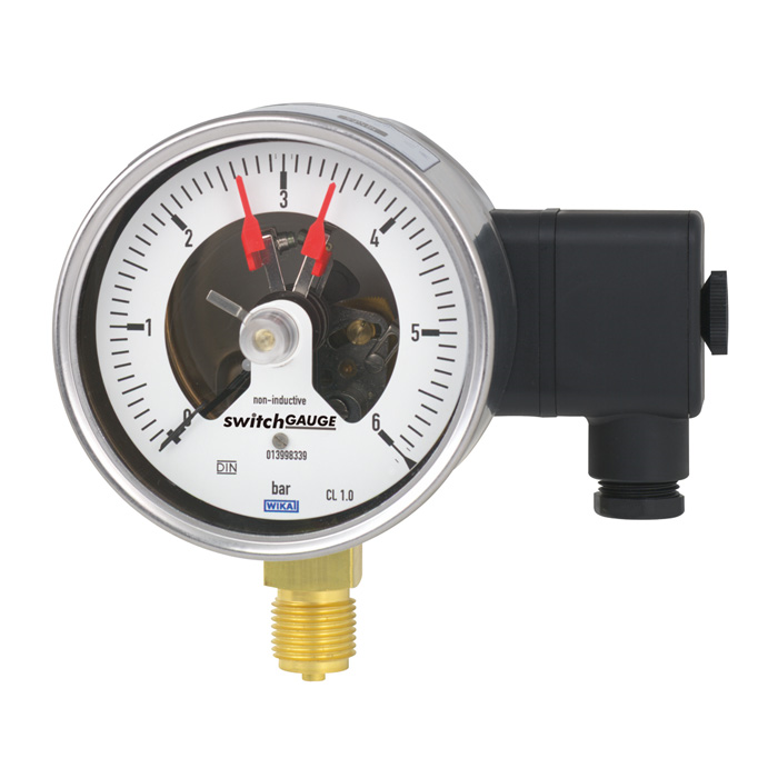 開關(guān)電接點(diǎn)(報(bào)警用電子式電接點(diǎn))可根據(jù)儀表的指針位置接通和關(guān)斷電氣控制電路。開關(guān)電接點(diǎn)在全量程范圍內(nèi)可調(diào)(參見DIN 16085)。通常情況下,電接點(diǎn)都安裝在表盤下面,只有少數(shù)是安裝在表盤上面。儀器指針(實(shí)際值指針)可在整個(gè)量程范圍內(nèi)自由旋轉(zhuǎn),與設(shè)定無關(guān)。